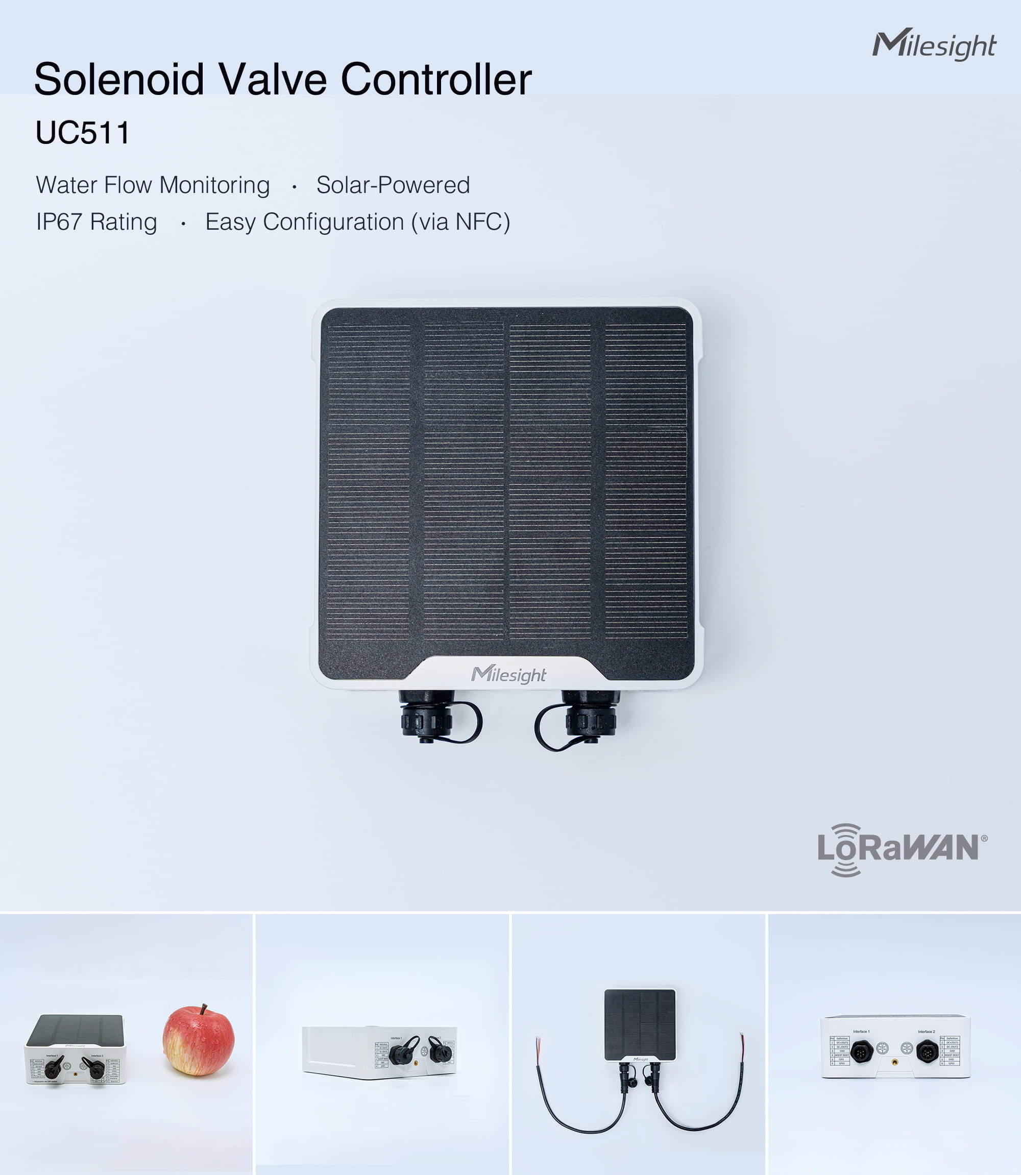 Durch den Einsatz von Solarstrom, einer integrierten wiederaufladbaren Batterie und IP68-Gehäuse eignet sich das Gerät ideal für freiluftbasierte Anwendungen wie landwirtschaftliche Bewässerung, Parkanlagen, Gartenbewässerung oder Versorgungsinfrastruktur. Die M12-Anschlüsse bieten robusten Schutz gegen Wasser und Staub auch unter extremen Bedingungen.